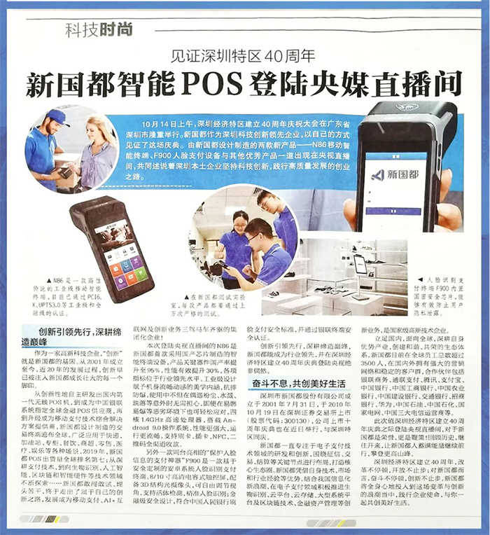 紧接着在前天10月21日,《深圳商报》刊发了一篇题为《见证深圳特区40周年 新国都智能POS登陆央媒直播间》的新闻报道。报道讲述了新国都成立19年来,一路敢闯敢试、埋头苦干,不断创新成为一家产品远销全球、支付行业领先、创新业务并举的集团化企业的发展故事。